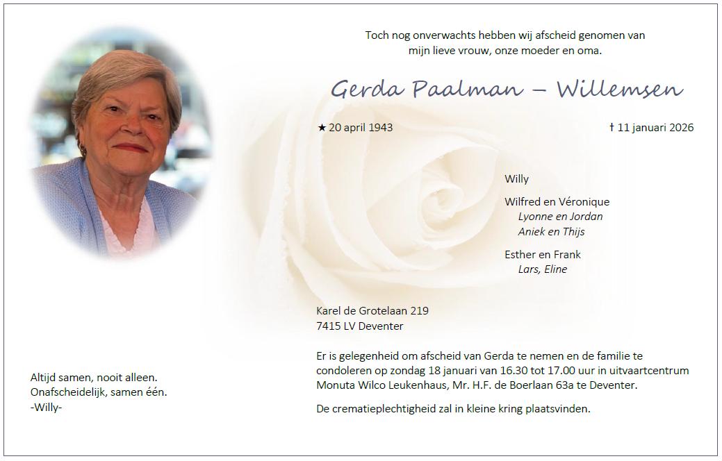 Ons bereikte het droevige bericht dat Gerda Paalman-Willemsen, vrouw van erelid Willy Paalman, op zondag 11 januari jl. is overleden.